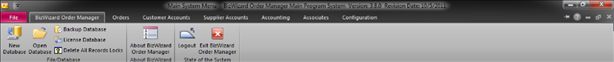 BizWizard Order Manager™ Menu is used to create a New Database, Open an existing Database, License you’re Database, Backup your Database, Export your Database, Logout of BizWizard Order Manager™ and Exiting BizWizard Order Manager™.