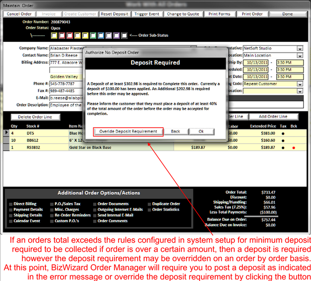 In BizWizard Order Manager™ Configuration menu under System Setup you can define any deposit requirements (see Order Setup) for any new order (order deposit setup). This will require the sales Associate to collect a deposit for the order before being able to save the order into the database for processing. However, there may be occasions where you wish to override the system configuration deposit requirement on an order by order basis.