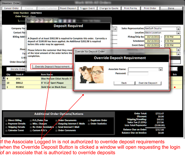 If you are logged in with the authority to override the requirement (see Manage Security), the override successful window will open and the override of a deposit has been completed allowing you to save the order into the system.