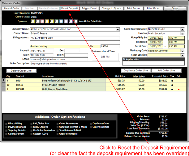 To reset the override requirement for any reason on an order, simply click the reset deposit button on the top of the Maintain Order Screen :