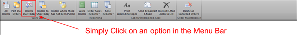 BizWizard Order Manager™ utilizes an Office 2007/2010 Style menu System. In this section we will learn how to use the menu to navigate to the various portions of BizWizard Order Manager™. Specifically, let’s take a look at one of the menus in the example below